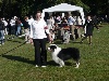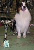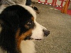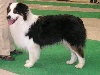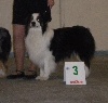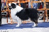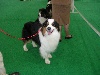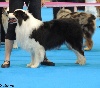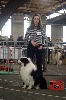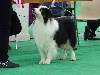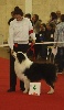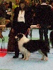 10 ans, pleine forme. Exc construction, très compact. Exc tête avec b. expression très gentille. Tricolore en noir. B. distribution couleur. Exc qualité poil. TB dents. Thorax bien développé. Exc mouvement. Ring d'honneur NC